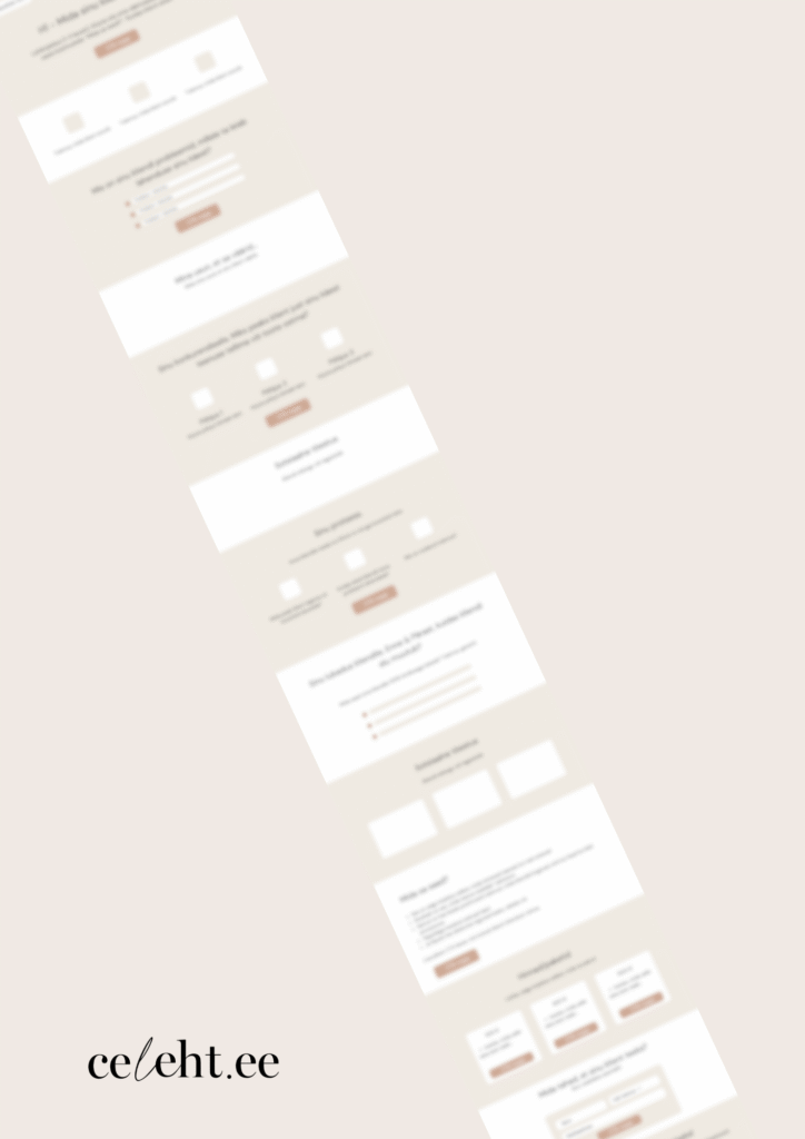 Kliendi teekonnal põhinev sisulehe raamistik Was Now €59 Sale Praktiline ja koheselt kasutatav raamistik, mille abil saad üles ehitada sisulehe, mis juhib külastaja tähelepanu loogiliselt ja veenvalt veebilehe eesmärgiks oleva tegevuseni. Tegemist on universaalse struktuuriga, mis sobib nii esilehele, teenuselehele kui ka toote maandumisleheks. Kodulehe sisuleht ei tohi olla lihtsalt tekstiplokk, kus kirjeldad seda, mida sina teed. See on koht, kus tuleb välja tuua kliendi huvid, tulemused ja soovid. See raamistik aitab sul struktureerida oma sisu nii, et see vastaks külastaja loomulikule küsimuste jadale enne kui need tekkida jõuavad. Lähtub kliendi mõtlemisest ja liikumisloogikastAitab sul selgelt vastata küsimustele: Miks ma peaksin edasi lugema? Kuidas sa mind aitad? Mida ma edasi teen?Eemaldab “valge lehe hirmu” ja juhendab sind sisu kirjutamisel ja disaini loomiselTootega saad PDF veebilehe struktuuri + kasutamise juhendi. Quantity Enter an amount € Add to Cart Add to Cart You may also like Previous Next Sale Ettevõtlike Mõtete Visioonitahvel €26.90 Compare to €34.90 Sale E-poe tootekirjelduste koostamise juhend + testitud AI prompt €25 Sale Kuidas luua kodulehe sisu, mis teeb külastajast kliendi? €59